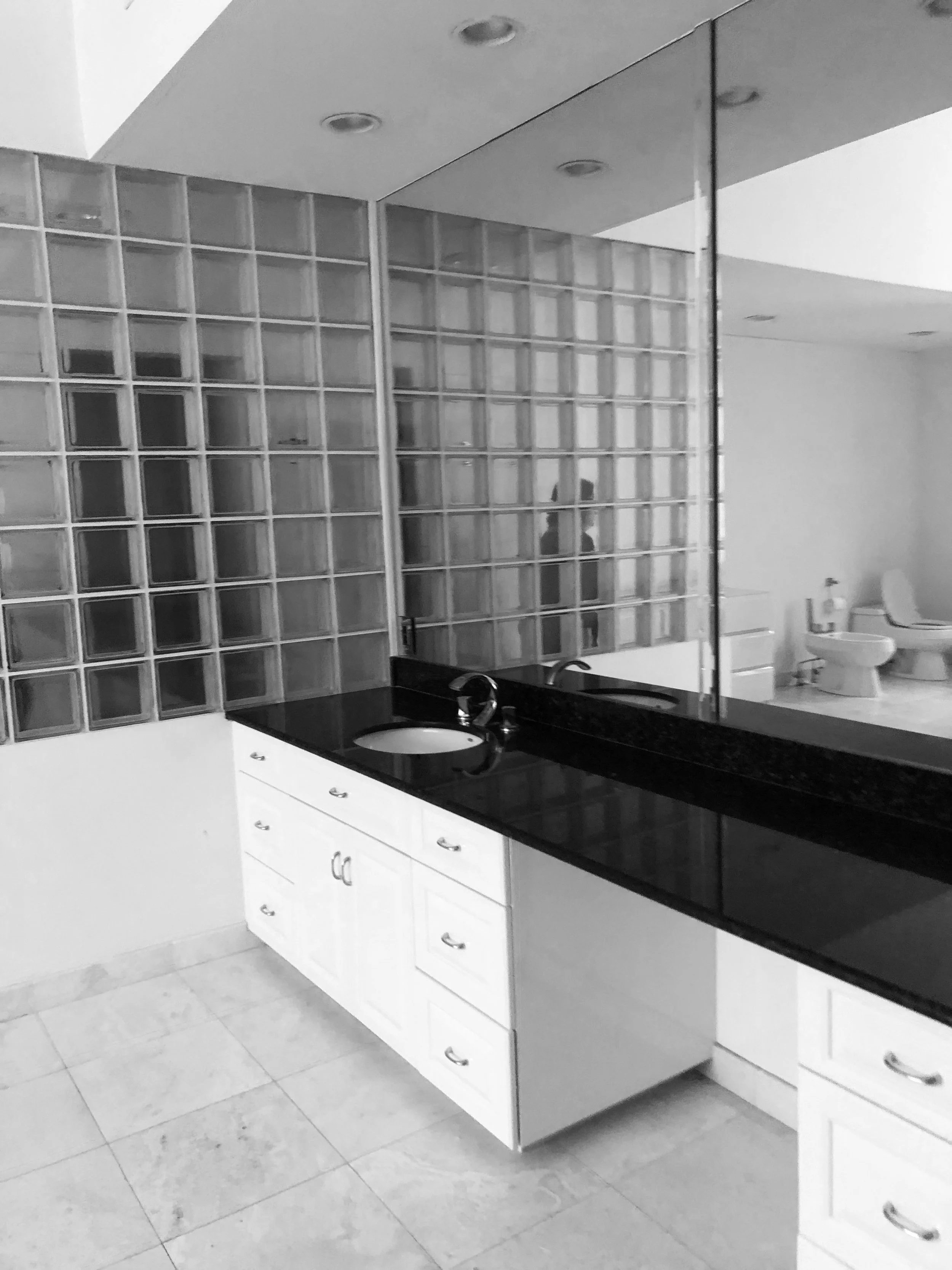 A spacious, bright, light-filled home in the leafy borough of Alpine NJ is brought up to date with the use of a fresh pale grey blue palette injected with carefully selected splashes of colour.